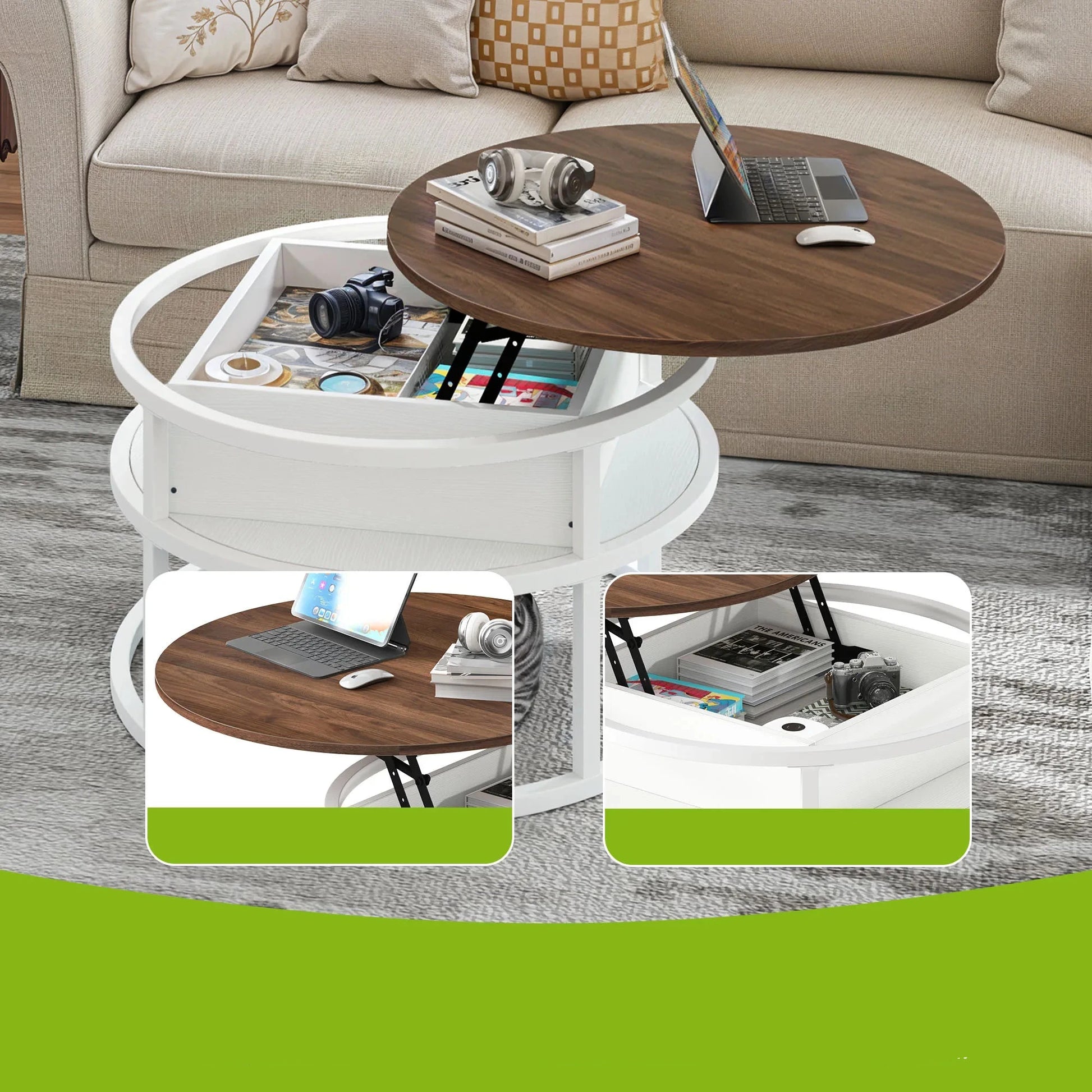 Table Basse Relevable Capri – Ronde avec Rangements Intégrés