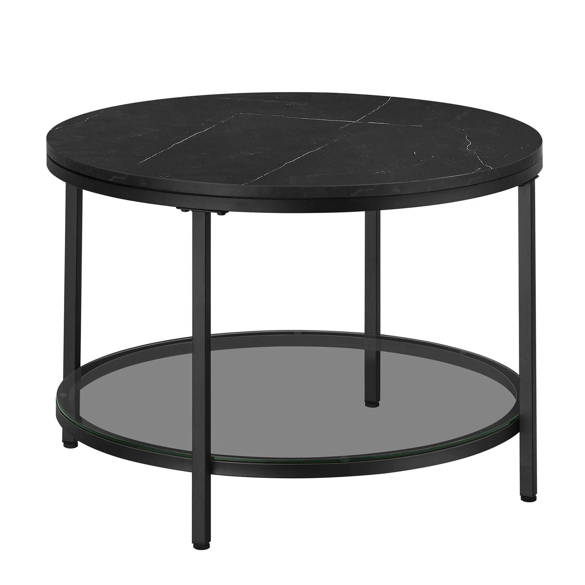 Table basse ronde Lyra : une silhouette moderne effet marbre noir et étagère en verre trempé pour un salon sophistiqué